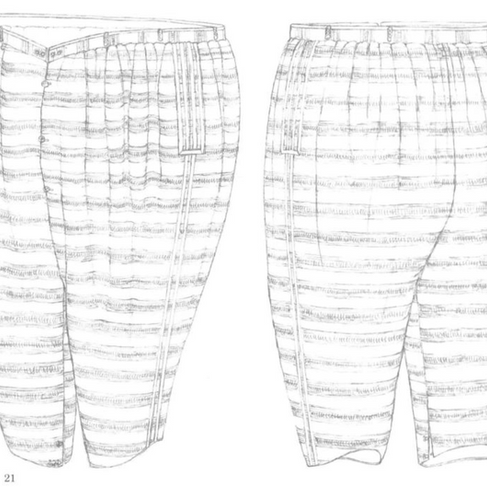 Pludry jakie są każdy widzi. Nie chciałem robić wielgaśnych pluder, bardzo szerokich, bo nie wiem na ile to jest problematyczne na okręcie gdy trzeba się przemieszczać po tych ich masztach, rufach, linach, kontrmarszach i innych ferszalunkach. Jednocześnie nie czułem klimatu na długie spodnie, też znane pośród marynarzy. Stwierdziłem, że pójdę w kierunku pludrów węższych, nadal jednak w miarę pełnych, wyposażonych w haftki do mocowania z dubletem oraz z nogawką, którą można jakoś delikatnie zregulować (guziki? Sznurek? jeszcze nie miałem pewności co do rozwiązania). Chciałem nawiązać bazą do konkretnego zabytku i z tego tez powodu wybór mój padł na pludry, które można znaleźć u Janet Arnold w 3 tomie jej "Pattern of Fashion".